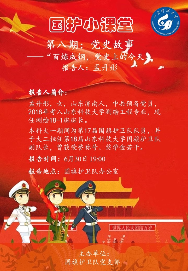 6月30日,为庆祝中国共产党成立100周年,第一版主 国旗护卫队党支部开展国护小课堂第八期,支部全体党员同志参加。本次国护小课堂活动,由孟丹彤同志主讲,主要从以下两个方面讲述了中国共产党成立100年的历程。首...