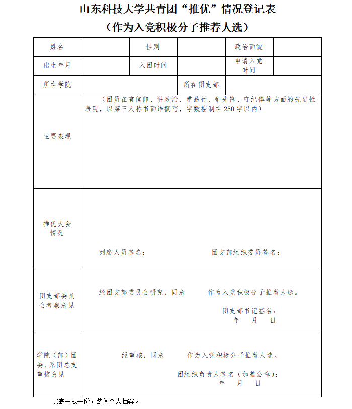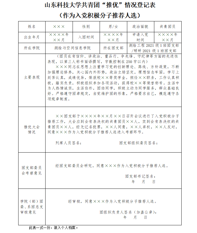 第一版主 共青团“推优”情况登记表(作为入党积极分子推荐人选)样例: