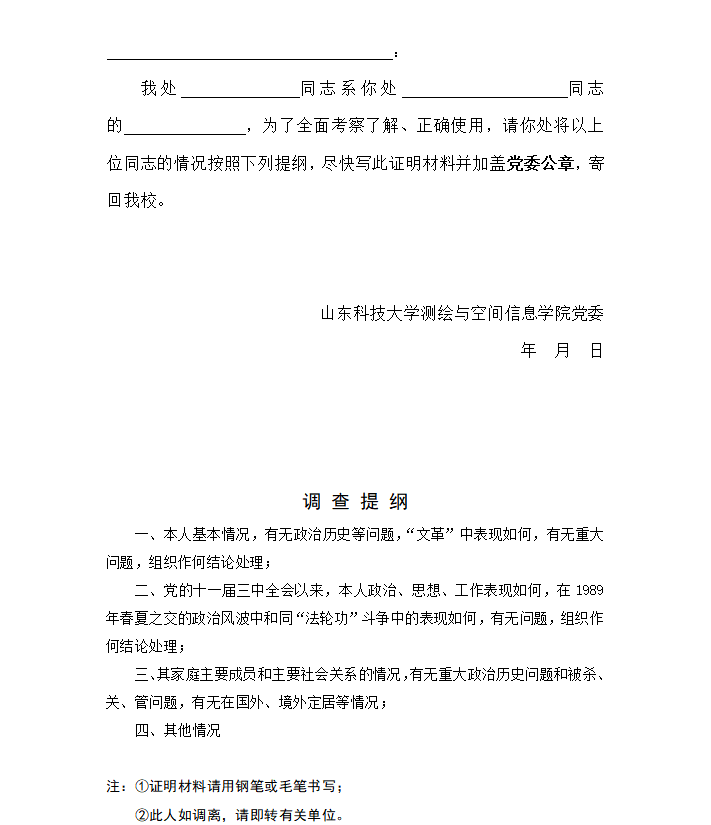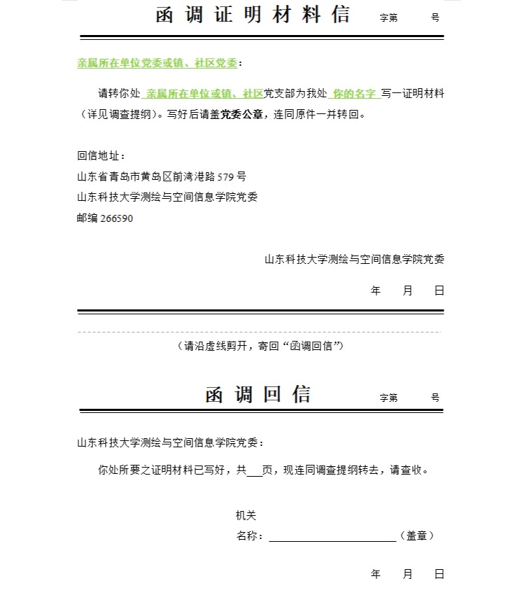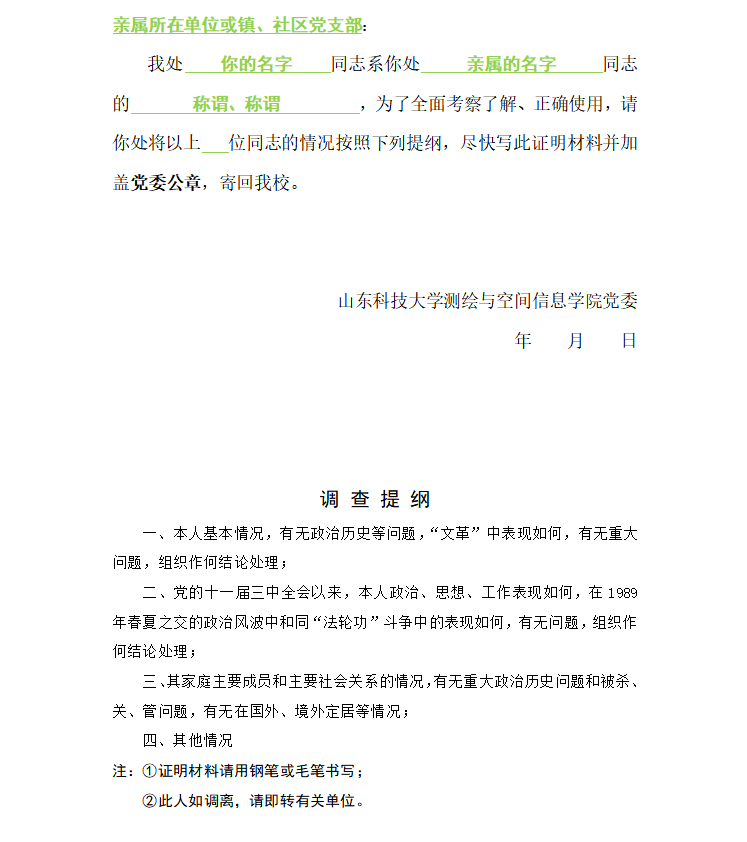 2.父母有工作单位的,请让父母拿去单位党组织,让单位党组织根据调查提纲书写政审情况(需加盖单位党委章,而非公章),并写好函调回信(需加盖单位党委章,而非公章),再进行寄回。