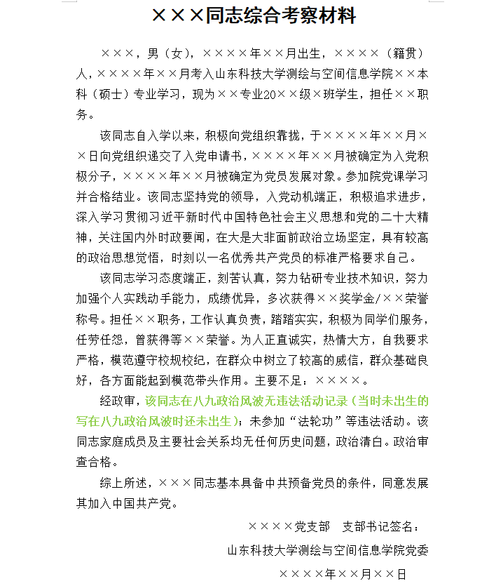 ×××同志综合考察材料报告格式参考模板,如附件下载打开后字体为微软雅黑,应调整为仿宋_GB2312或仿宋,现实表现请结合发展对象个人如实、贴切地进行表述,而非照搬照抄,如能结合发展对象时事政治学习情况更佳,综合考察材料落款时间应落在政审材料全部到齐以后。