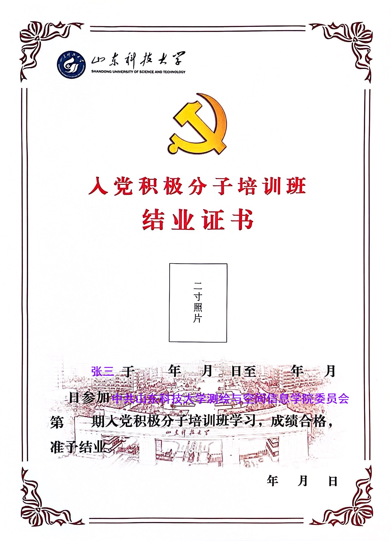 入党积极分子培训班结业证书样例:
