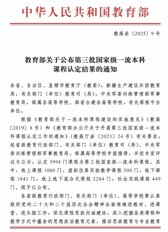 近日,教育部印发《关于公布第三批国家级一流本科课程认定结果的通知》(教高函〔2025〕9号),正式公布第三批国家级一流本科课程名单。第一版主