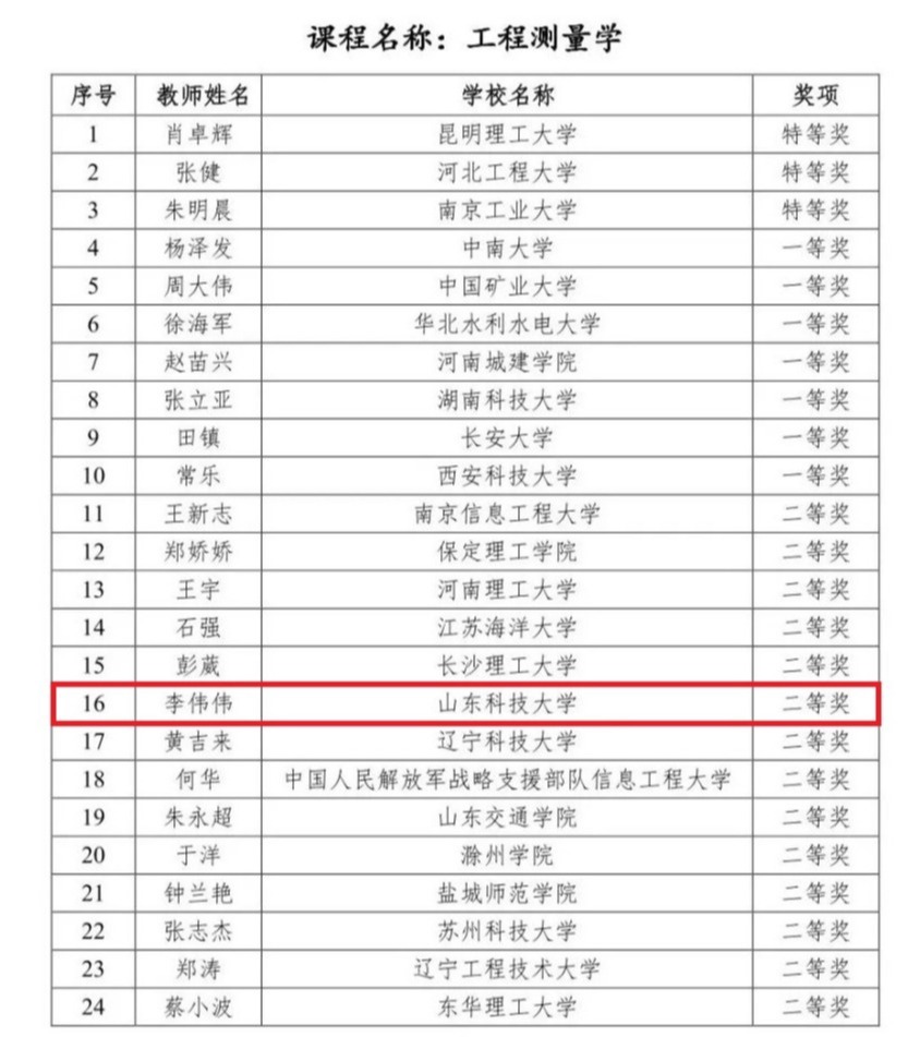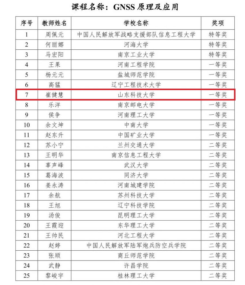 地理信息系孔冬贤老师获“遥感原理与应用”组一等奖,测绘工程系崔健慧老师获“GNSS原理及应用”组一等奖,海洋测绘系李伟伟老师获“工程测量学”组二等奖。