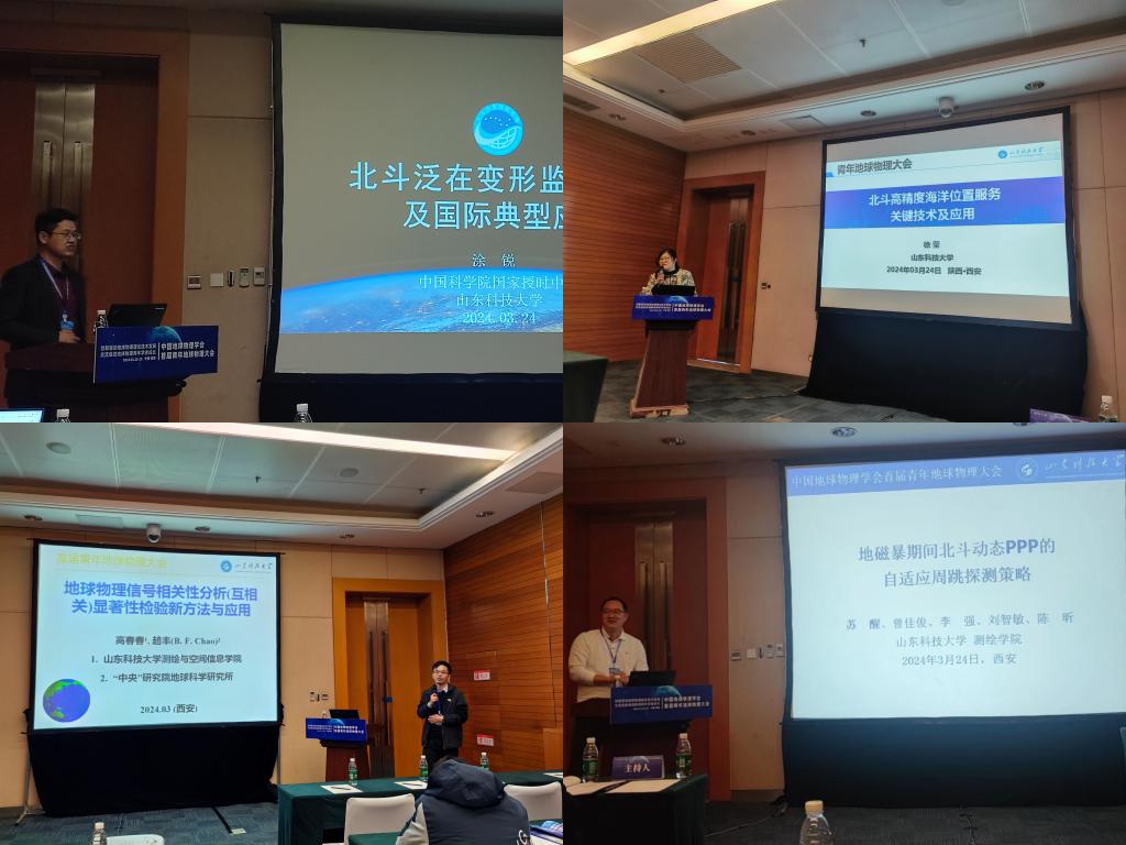 涂锐教授在应用大地测量分会场作了题为《北斗泛在变形监测及国际典型应用》的报告,徐莹教授在卫星大地测量分会场作了题为《北斗高精度海洋位置服务关键技术及应用》的报告,高春春教授在物理大地测量分会场做了题为《地球物理信号相关性分析中显著性检验的新方法与应用》的报告,苏醒老师在应用大地测量分会场作了题为《地磁暴期间北斗动态PPP定位及时间传递研究》的报告。
