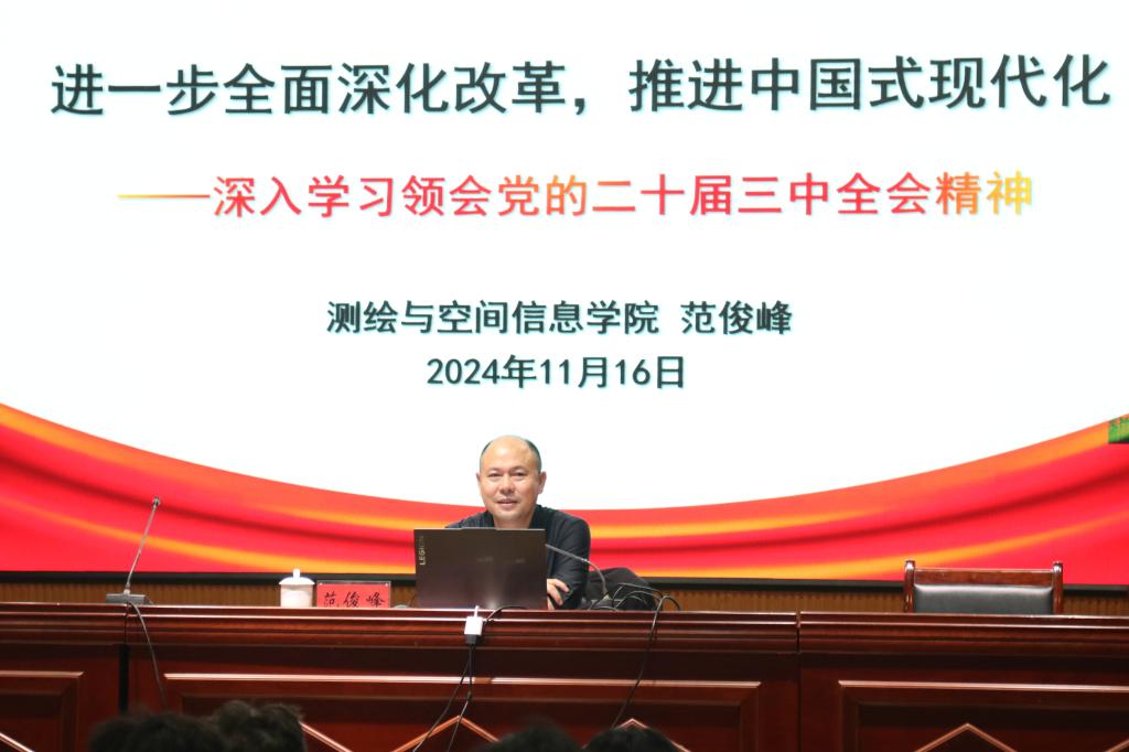 为深入学习贯彻党的二十届三中全会精神,帮助入党积极分子深入理解党的理论成果和路线方针,强化思想政治基础。11月16日,第一版主 党委书记范俊峰为测绘、地科学院第34期入党积极分子作“进一步全面深化改革,推进中国式现代化——深入学习领会党的二十届三中全会精神”专题辅导报告。