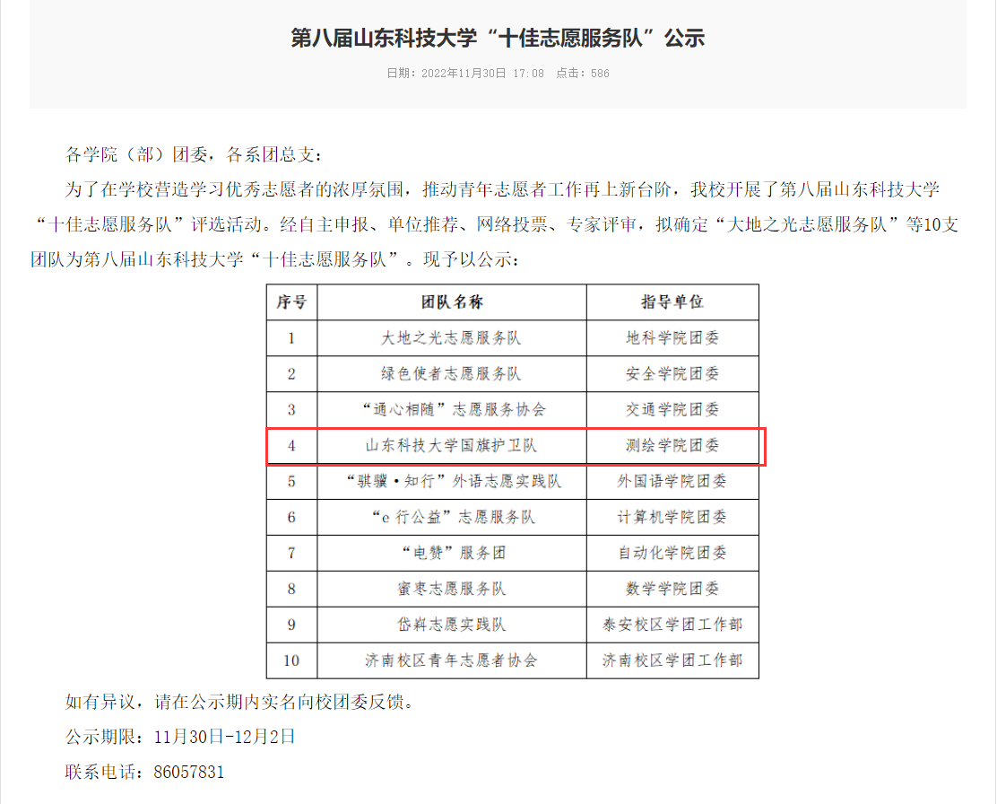 “十佳志愿服务队”评选活动的公示名单中,“国旗护卫队”赫然在目,经过自主申报,单位推荐,专家评审,网络投票等多个环节,国旗护卫队脱颖而出,在评选过程充分体现了顽强拼搏,团结一心的国护精神,受到了学校师生的一致赞誉。
