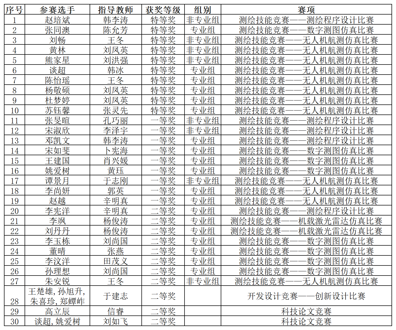 不断提高学生创新能力、推进产教融合的生动实践。下一步,学院将深化学生创新实践能力培养,落实“以赛促教、以赛促学、以赛促创”的理念,不断激发测绘学子的创新潜能与创业热情,为行业发展培育更多新时代测绘人才。(通讯员:韩冰)