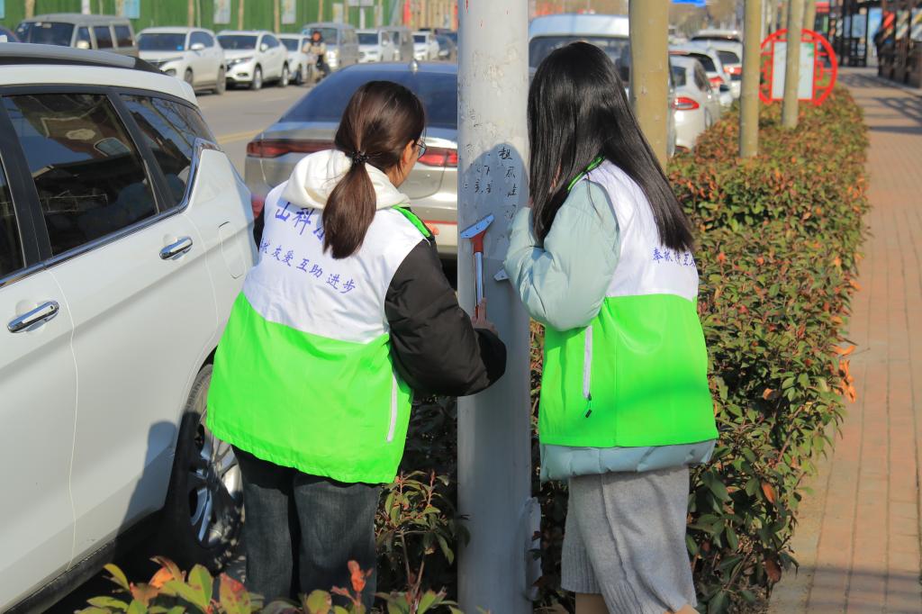 下午2点30分,志愿者队伍在泰山广场集合后来到奋进北路社区,秉持着安全第一的原则,有组织地开展社区卫生清理工作。志愿者们拿着清扫工具,捡拾塑料袋、塑料瓶、果皮纸屑及烧烤竹签等生活垃圾,并进行归类处理。志愿者们配合默契,高效率地完成了这一部分的工作,为建设社区新风貌贡献了一份力量。与此同时,遥感科学与技术2022-3班学生代表前往泊子社区向居民宣传普及反诈知识,用生动的案例向社区内反诈意识较薄弱的老人们进行了反诈科普宣传。最后,青协志愿者与学生志愿者汇合,将社区内违规充电的电动车停放至合适的位置,减少安全隐患。