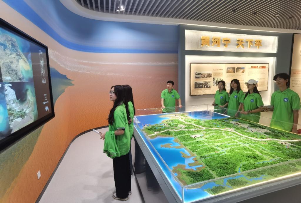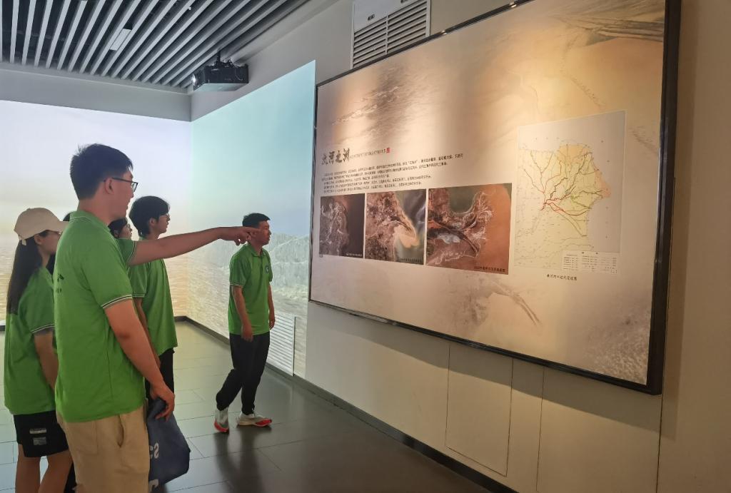 文化馆的建筑方正,形似中国传统礼器——鼎的造型,正面上方镶嵌着黄河儿女战天斗地、繁衍生息的巨幅浮雕。成员们学习了关于黄河和东营的故事,深刻体会到了黄河文化馆通过“志说黄河、志说东营”形式展现的宏观、立体、人文、生动的黄河。感受到黄河的波澜壮阔和黄河文化的博大精深。馆内以“大河奔流”为主题,分为“中华母亲河”和“魅力黄河口”两大板块,共设八个展厅,内容涵盖黄河起源、大禹治水、历史上黄河六次大改道、沿岸风土人情、东营的历史文化、胜利油田的开发利用,以及当代黄海入海口的湿地保护等篇章。学生们在参观的过程中,在指导老师崔晓东老师的指导下,通过学科专业视角对展馆内容进行深度解读,将专业知识与展馆内容相连接,从遥感技术的视角解读黄河的形势与变迁,通过海洋测绘技术展现黄河入海口的湿地保护与海洋资源利用等重要篇章。
