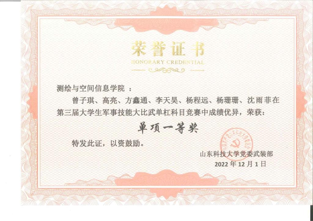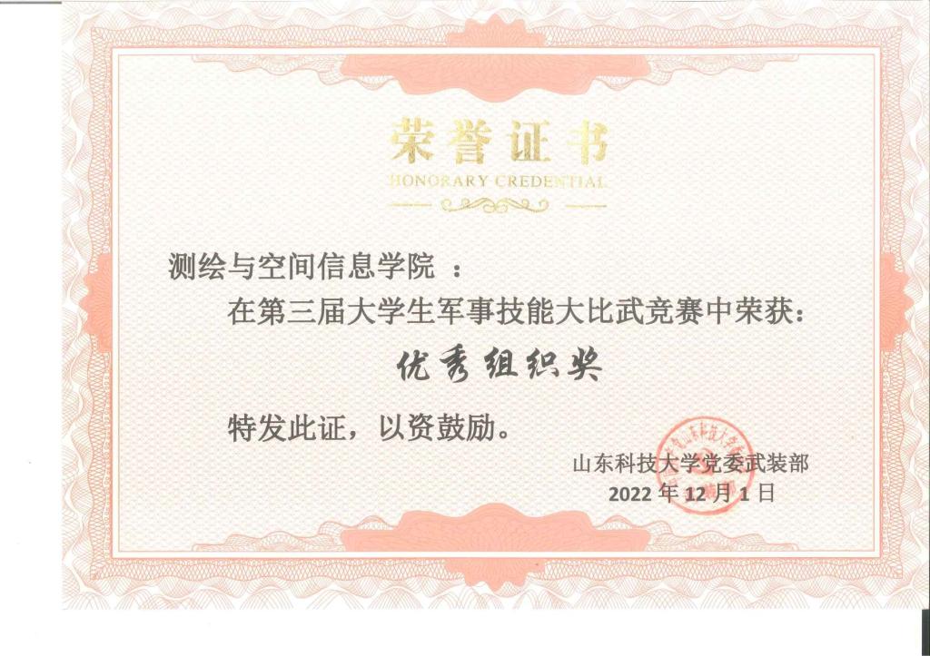 代表队全体队员们展现出了极高的比赛素质和顽强拼搏的精神,展示出了测绘学子拼搏向上、积极进取的良好精神风貌,在学校第三届大学生军事技能大比武中取得多项佳绩。