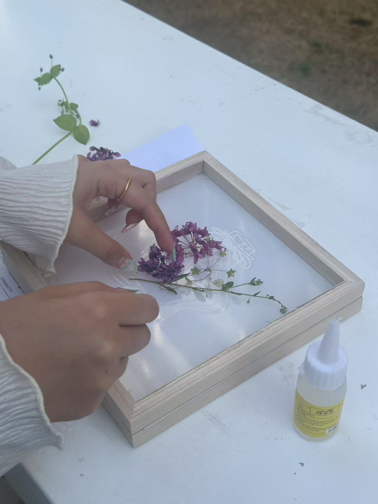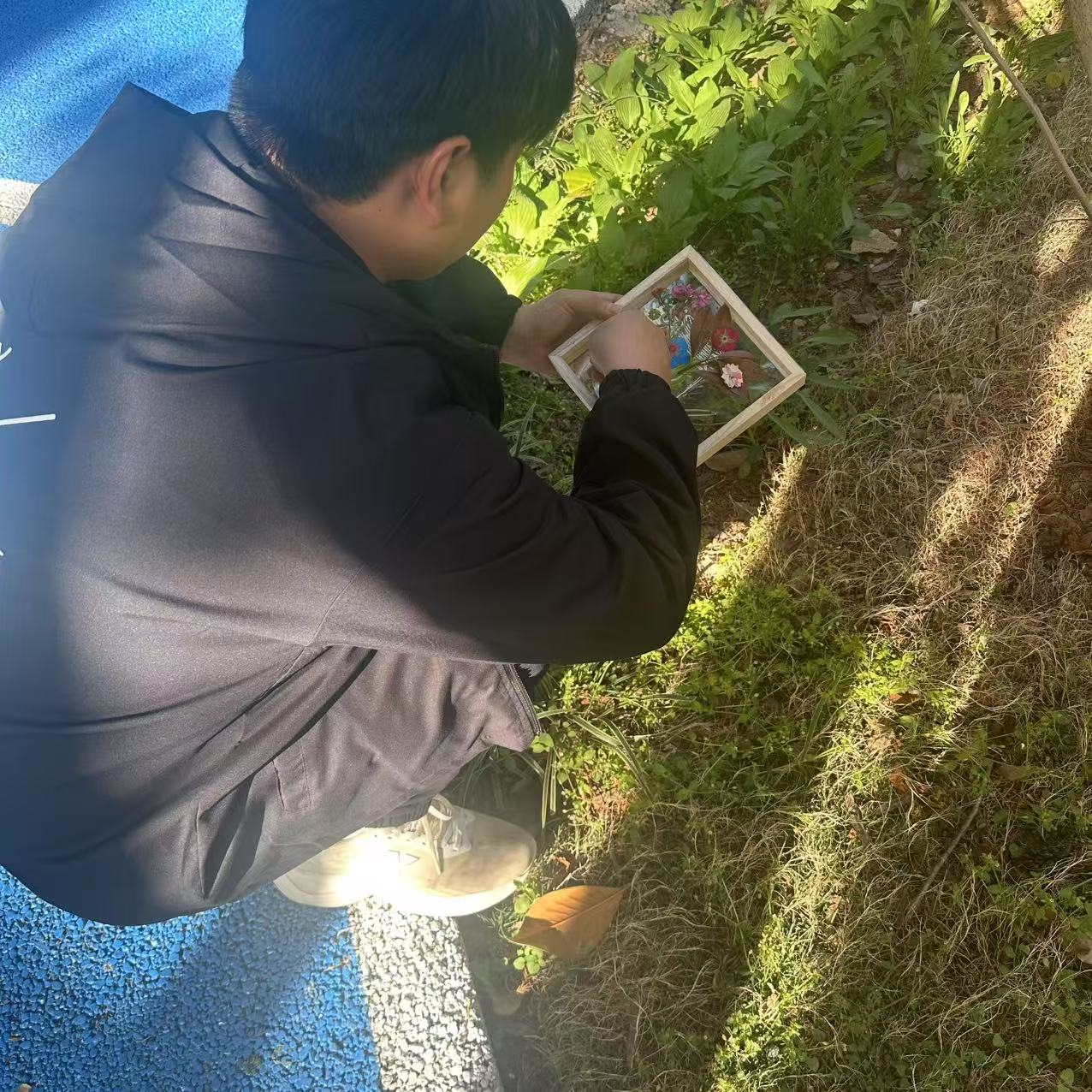 活动初始,参与学生通过闭眼触摸泥土、聆听风声、嗅闻花香等方式,用五感记录春日韵律。随后,在工作人员的引领下,参与学生以自然为画布,用枯枝、花瓣、树叶等生态环保材料创作了属于自己的艺术作品。同学们或是独自创作,或是两人协作,秉持“零废弃创作”理念,将落花与绘画、文字相结合,拼贴出一幅幅充满想象力的作品,每一幅都展现着对春天的独特理解。同学们纷纷感叹,原来平时脚下不起眼的落花也能成为艺术作品。