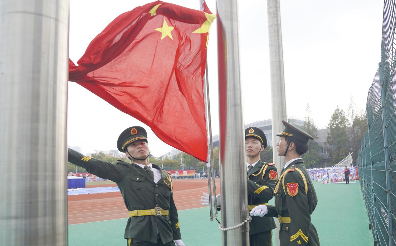 伴随着激昂的进行曲,国旗护卫队迈着铿锵有力的步伐,沿跑道庄严行进至升旗台。队员们动作标准、步调一致,全程姿态挺拔、目光坚定,充分展现出严谨的作风与昂扬的精神面貌。在庄严的国歌声中,升旗手奋力扬起五星红旗,全场人员行注目礼。在嘹亮的国歌声中,五星红旗缓缓升至旗杆顶端,在体育场上空迎风展开。