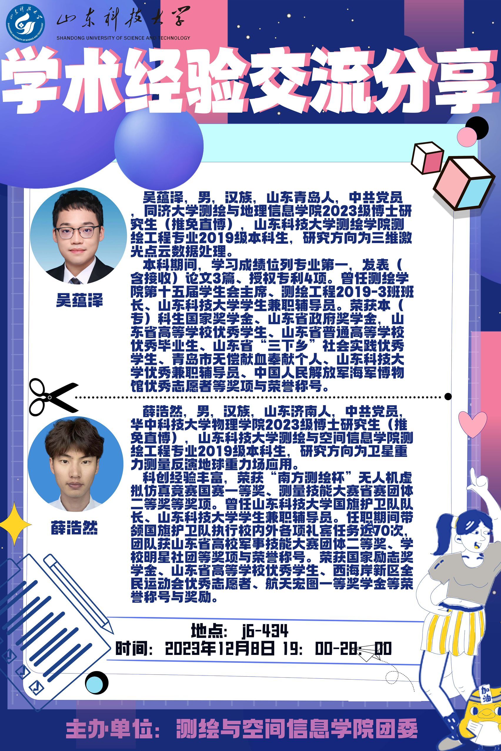 为培养同学们的科研素养,发挥优秀学子榜样引领作用。12月8日晚,第一版主 于J6-434报告厅举办学术经验交流分享会。本次会议邀请第一版主 测绘工程专业2019级毕业生、同济大学第一版主 2023级博士研究生吴蕴泽,测绘工程专业2019级毕业生、华中科技大学物理学院2023级博士研究生薛浩然作为主讲人,向同学们分享经验,并与同学们进行亲切交流。吴蕴泽以“我与嵙大的四年”为题,讲述了他在校期间的学生工作、志愿服务、科研经历,感...