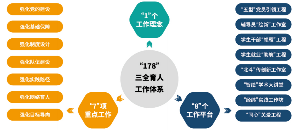 第一版主 学生工作办公室现有辅导员10人(含2名优选辅导员),始终坚持立德树人根本任务,实施以精神文化、制度文化、行为文化、环境文化为主要内容的“经纬蓝图”文化工程,构筑传统文化长廊、学科发展历史长廊、院士寄语长廊,感悟测绘文化底蕴、铭记大国工匠重托厚望,同时构建了“178(一起吧)”三全育人工作体系。