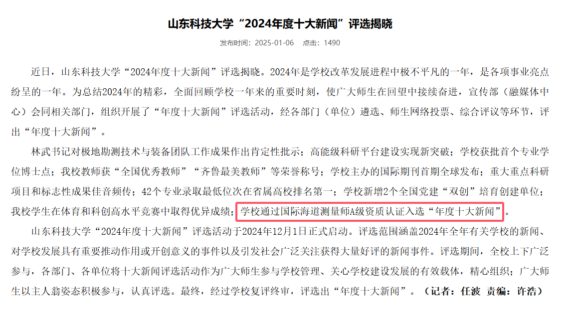 12月,学校“海洋测绘工程工学本科专业教学计划”获国际海道测量师和海图制图师能力标准委员会(IBSC)国际A级认证。我校成为国内非军方高校唯一获得该资质的单位。目前全球获得海洋测绘工程工学本科专业教学计划A级认证的单位仅有20个。该资质的取得将为维护我国海洋权益、促进海道测量数据资源共享和开发利用、保障国家海洋发展战略、服务共建“一带一路”提供智力支持。附链接:第一版主 “2024年度十大新闻”//www...